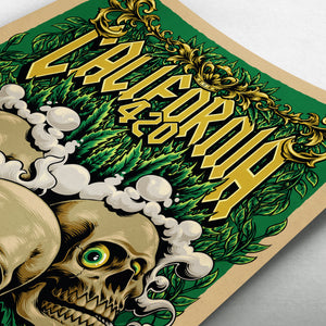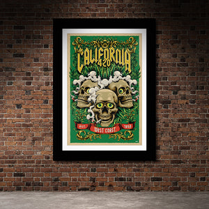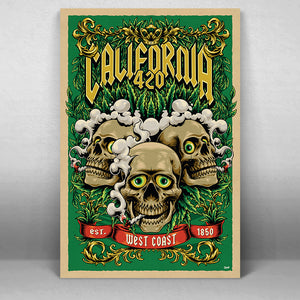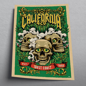 Celebrate California’s iconic 420 culture and bring West Coast flair to your space with this vibrant, one-of-a-kind illustration! Featuring three smoking skulls framed by lush foliage and striking gold accents, this poster is perfect for art lovers, cannabis enthusiasts, or anyone looking to add bold style to their home or workspace.